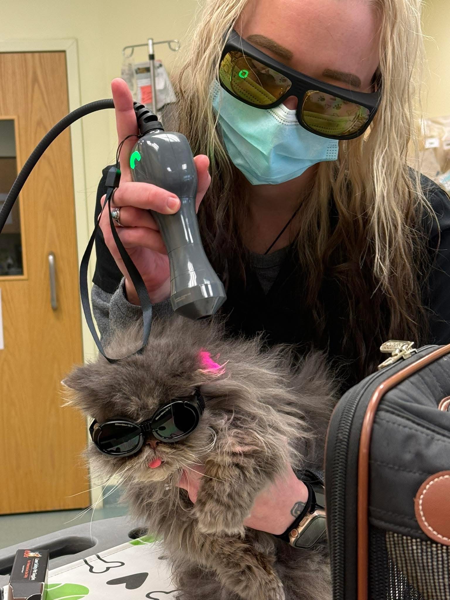 Cold laser therapy is non-surgical, medication-free, and well tolerated by most pets. Protective eyewear is used during treatment for safety.